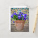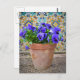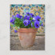 Purple pansies in a flower pot against a geometric patterned background. So pretty!