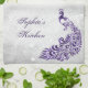 Add a unique touch to your kitchen with a Purple Peacock Personalized Kitchen Towel. Kitchen towel design features a vibrant purple peacock, a soft white leaf vine against a light grey grunge background with an area to personalize with your name. Additional gift items available with this design as well as a variety of colours.