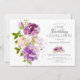 Invitation florale à la fête du 16e anniversaire avec de magnifiques peintures à la main violet & crème peonies & feuilles vert feuillu. Retournez notre invitation pour voir un papillon d'aquarelle violet coordonné pour une touche spéciale supplémentaire.