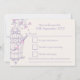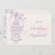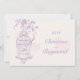 Cute bird couple in line art graphic drawing of open bird cage hanging from a blossoming spring tree with hearts. Fashionable modern chic wedding design part of the bird cage romantic wedding stationary set. Pretty pastel colours of purple, pink and ivory cream. Edit this RSVP invitation with your names, dates and wording. Unique line art drawing and design by Sarah Trett.