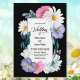 A vibrant black-bordered floral wedding invitation featuring pink and purple flowers, white daisies, and greenery surrounding the text. Perfect for a garden wedding.