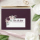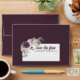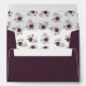 Your Save the Date cards will never get lost when they arrive in this beautiful deep purple floral envelope. A white rectangle is placed on the front of the envelope so you can easily add the recipient's name and address. It is decorated with deep purple and blush pink roses nestled in sage green leaves and vines. Save the Date is written in a large dark purple script font. Your name and address follow. The inside of the envelope is decorated with purple and pink roses. This item coordinates with the Purple Sage collection.