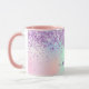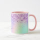 A trendy holographic background with unicorn and rainbow pastel colours in pink, purple, mint green. Decorated with confetti. Personalize and add a name, written with a modern hand lettered style script with swashes. Purple coloured letters. To keep the swashes only delete the sample name, leave the spaces or emoji's in front and after the name.