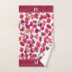 This colourful 3 piece bath towel set has purple, pink, and tangerine floral watercolor poppy images which fill up the pattern. Along with the various poppy images are soft green leaves and stems. It's virtually a kaleidoscope of colour, and will definitely brighten any bathroom. On the bath towel and hand towel, each end has a solid matching border with your monogram. Be sure to see the matching shower curtain and bath mat in our store.