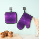 Purple pot holder and oven mitt set with black trim. The geometric pattern on the front adds a modern touch, while the back is plain black.
