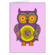 A cute cartoon psychedelic owl in purple, lime green and rainbow colours.