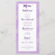 This elegant menu card has a purple quatrefoil background and purple script headers on a white decorative box. Perfect for letting your guests know what they will be eating!