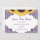 Elegant purple rustic sunflower wedding save the date cards featuring sunflower flowers and purple floral lace. Matching items available to complement these purple rustic chic wedding save the date cards.