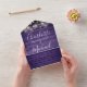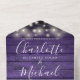 All in one wedding invitation featuring pretty string lights, mason jars, signature style names and chic typography on a purple rustic wood background. The invitation includes a perforated RSVP card featuring a QR code. Designed by Thisisnotme©