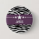 Trendy and modern Sassy Star Zebra Button featuring a chic black and white zebra print background and a bold purple border adorned with a fun star motif. This girly design may be customized with the personalized text of your choosing. Click "Customize It" to find more personalization options.