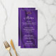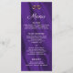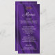 A stylish and elegant purple wedding menu for the wedding reception, featuring a lush, luxe purple pattern of silk. There is a small pair of golden wedding rings at the top on the front of the menu, and all details can be personalized to suit. On the back of the card is the same silky purple design with a custom pair of bridal monograms that can also be customized to suit.