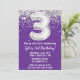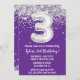 Purple and silver 3ème anniversaire invitation à la fête d'âge 3 anniversaire invitation à la fête d'anniversaire avec parties scintillant et écriture de script moderne et ballon amusant.
