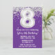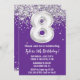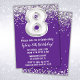 Purple and silver8th birthday party invitation age 8 birthday party invitation with glitter and modern script writing and fun foil balloons.