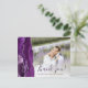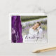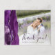 This elegant wedding thank you postcard features a purple watercolor agate border trimmed with faux silver glitter. Easily replace the sample image with your own photo of the bride and groom. The customizable text overlay combines dark purple handwriting script and copperplate font; a white gradient filter helps make the text pop. Add your return address and a message of thanks to the reverse side.