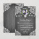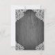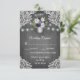 Purple Silver Grey Floral Lace Wedding RSVP Cards - feature grey or silver vintage/rustic barn wood background with string lights and floral lace. The design also features elegant flowers in various shades of purple in a silver mason jar that you can customize to the initials of your choice.
