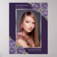 Elegant purple floral photo celebration of life/funeral welcome sign featuring purple roses and baby's breath flowers decorating a photo inside a silver frame. Matching items available.