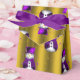 A cute and colourful gold gift bag featuring a pattern of little snowmen dressed in purple velvet top hats and vests, surrounded by gold stars to make your gift giving truly special this holiday season.