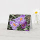 Colorful trio of blooming purple spring crocuses announcing the arrival of a new spring season of joy and renewal.