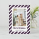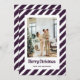 Purple photo Merry Christmas card featuring little stars against a purple and white striped pattern. Easily personalize this festive holiday card with your photo and a family name.