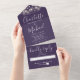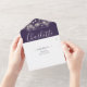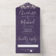 All in one modern minimalist wedding invitation featuring pretty string lights and elegant signature script name and monogram initials on a purple background. The invitation includes a perforated RSVP card. Designed by Thisisnotme©