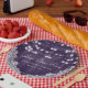 Elegant rustic country purple wedding paper plates featuring rustic wood adorned with white floral lace and string lights.