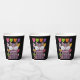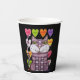 These paper cups are black with a cute purple cat with stripes and bright green eyes sitting in front of a wall of colourful candy hearts with love sayings.