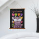 This tapestry with wood hangers has a sweet purple striped cat with green eyes with a wall of colourful candy Valentine hearts behind him with love sayings on a black background. Customize your text with the template.