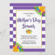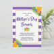 This colourful, whimsical yet elegant design features a stunning bouquet of bright, beautiful flowers in bold shades of orange, yellow, blue, pink, and purple against a high-contrast background of purple and white stripes.The customizable location, RSVP and contact details appear inside a gold edged white area in the centre in popular typography, with the words "Mother's Day Brunch" appearing in darker purple.