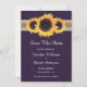 Custom rustic purple and sunflower wedding save the date card featuring sunflowers against a vintage burlap and lace background adorned with string lights.