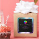 The design features a bright shimmering purple teal glitter frame with tiny glitzy stars on a plain black background.