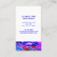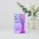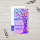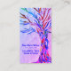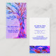 This vibrant business card features a print of a multicolored tree on a purple and pink background.