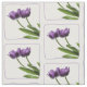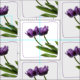 Purple and green colors in a floral design of mixed media. This is floral photography of two purple tulips. The flowers in the photo were isolated and placed in a graphic, doodle frame over a white background. The moif was repeated in offset rows to create a seamless, all-over print pattern.