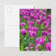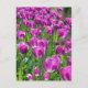 A bed of pretty purple tulips with sunlight casting shadows in the petals welcoming spring. Pond in the background.