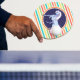 Cute, purple fantasy unicorn on colourful bright rainbow stripes, red, orange, yellow, green, aqua turquoise pattern
