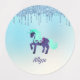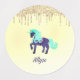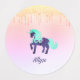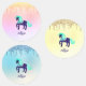 This design features a teal and muted purple unicorn, almost like a fanciful pony on a carousel, with faux silver glitter dripping onto three different pastel coloured backgrounds. The background colours are gradient, and include mostly yellow, mostly pink, and mostly blue. Type your child's name in the Personalized section, and it will appear in muted purple.