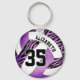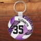This bold girl's volleyball keychain features a wild zebra stripes accent pattern on four of the volleyball's panels - the zebra stripes panels plus three other panels have a purple background that contrasts with the remaining white volleyball panels - customize with player name and jersey number - by katz_d_zynes