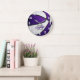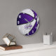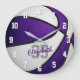 This personalized basketball wall clock is suitable for a girl or a boy and features the realistic image of a basketball that has alternating purple and white recolored panels and clock face numerals - personalize with player name in an "autograph" style font overlying the athlete's jersey number - by katz_d_zynes