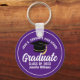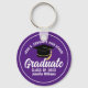 This modern purple and white custom senior graduate keychain features your high school or college name for the class of 2024. Customize with your graduating year under the chic handwritten script and black grad cap for a great personalized graduation key chain gift.