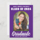 This modern purple and white custom senior photo graduate announcement features your high school or college name for the class of 2024. Customize with your name under the chic, bold handwritten script for a great personalized graduation card. Add a 2nd full photograph on the back.