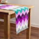 A 14” x 72” table runner featuring a beautiful, colourful pattern design of chevrons in plum purple ombre, lilac, white, minty teal, turquoise, and grey.