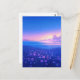 This ethereal postcard captures a magical twilight transition over a coastal meadow. The foreground is filled with a lush carpet of purple and blue wildflowers, their yellow centers glowing softly against the deep blue grass. The scene opens up to a calm, shimmering ocean under a vibrant sky that gradients from a warm golden-pink horizon into a deep, star-studded azure. Wispy purple clouds catch the last light of day, creating a dreamlike and serene atmosphere. This postcard is a beautiful choice for sending a peaceful greeting, a nature-inspired note, or a heartfelt message to anyone who loves the seaside at dusk.