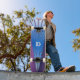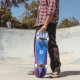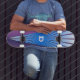 Dd brand skateboard, done in purple with a triangle of blue rays. Customize to add your own text.