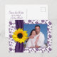 Purple and white floral damask yellow sunflower photo wedding save the date postcard. Pretty violet purple and yellow themed photo wedding save the date postcard. The flower on this black and yellow save the date is a bright yellow sunflower.