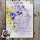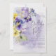 This simple but elegant birthday invitation design features a bouquet of purple, yellow, and lavender pansies and other flowers with greenery. The background is a purple watercolor splash on a textured white watercolor paper background. Created by Simply Farmhouse Press.