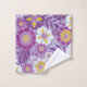 This bath towel set features flowers and leaves in shades of purple, magenta, yellow, and white on a purple background.