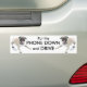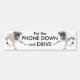 A digital photo of smiling pug laying down with a cell phone at his side. Text reads: "Put the PHONE DOWN and DRIVE". For everyone who has ever had road rage - this bumper sticker is for you!