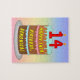 Cette conception de puzzle d'anniversaire colorée et optimisée présente une représentation de dessin animé d'un gâteau d'anniversaire à trois niveaux avec des bougies en forme de chiffre sur le dessus montrant l'âge "14", avec le message "HAPPY 14TH BIRTHDAY," et un nom de destinataire personnalisé. L'arrière - plan dispose d'un motif multicolore pastel en arc-en-ciel inspiré du spectre dégradé. Un casse-tête amusant et personnalisé comme celui-ci pourrait être donné pour célébrer le quatorzième anniversaire de quelqu’un. [~Z0000621]