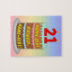 ce puzzle joyeux et optimiste, sur le thème de l'anniversaire, présente une représentation de dessin animé d'un gâteau d'anniversaire à trois étages avec des bougies en forme de chiffres sur le dessus indiquant le numéro "21", ainsi que le message "HAPPY 21ST BANTHDAY", et un nom de destinataire personnalisable. L'arrière - plan a un motif multicolore pastel en arc-en-ciel inspiré du spectre dégradé. Un puzzle d'anniversaire joyeux et personnalisable comme celui-ci pourrait être une façon amusante de livrer des voeux d'anniversaire à quelqu'un qui célèbre son vingt et unième anniversaire. [~Z0000621]
