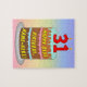 Cette conception amusante et colorée de puzzle à thème d'anniversaire comprend une représentation de dessin animé d'un gâteau d'anniversaire à trois niveaux avec des bougies en forme de chiffres sur le dessus montrant le numéro "31", avec le message "HAPPY 31ST BIRTHDAY", et un nom de destinataire personnalisable. L'arrière - plan dispose d'un motif multicolore pastel en arc-en-ciel inspiré du spectre dégradé. Un puzzle d'anniversaire gai et customisé comme celui-ci pourrait être une façon amusante d'envoyer des voeux d'anniversaire à quelqu'un qui célèbre son trente et unième anniversaire. [~Z0000621]