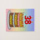 Ce puzzle à thème d'anniversaire joyeux et optimiste présente une représentation de dessin animé d'un gâteau d'anniversaire à trois niveaux avec des bougies en forme de chiffre sur le dessus montrant l'âge "38", avec le message "HAPPY 38TH BIRTHDAY," et un nom de destinataire personnalisable. L'arrière - plan a un motif multicolore pastel en arc-en-ciel inspiré du spectre dégradé. Un puzzle d'anniversaire coloré et customisé comme celui-ci pourrait être une façon amusante de donner des voeux d'anniversaire à quelqu'un qui célèbre son trente-huitième anniversaire. [~Z0000621]